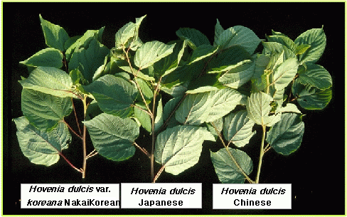 There is an easy identification method between domestic Japanese raisin tree (Hovenia dulcis var. koreana) and Chinese/Japanese raisin tree (Hovenia dulcis) with naked eyes. The petiole of the domestic tree is reddish and 3~7.6cm long. But the petiole of the Chinese tree is 1.5~1.8cm without reddish color.