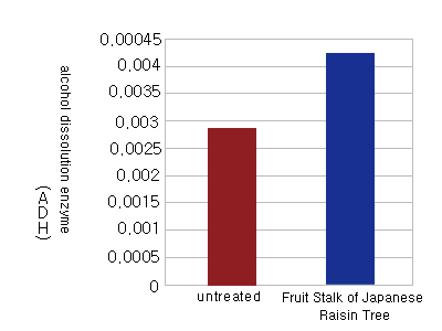 ▶ Does the Japanese raisin tree have effects for any organ? Answer: Reduction of the blood alcohol level is shown in the leaf, xylem, and fruit stalk of Japanese raisin tree. The xylem shows reduction effect of the blood alcohol level. But other effects are not shown on the treating model for liver toxicity, fatty liver, and hepatitis. The fruit stalk shows excellent effects for the reduction of blood alcohol level and the treatment of liver toxicity, fatty liver, and hepatitis. |